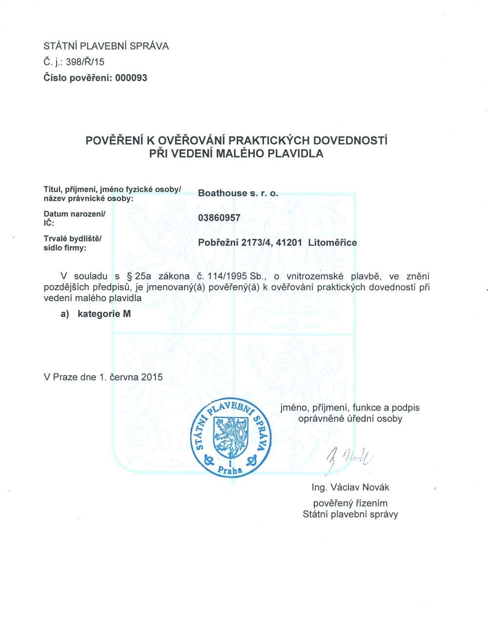 Nové osnovy z roku 2015 pro Ověření praktických dovedností při vedení malého plavidla, které se vztahují ke kategorii M ( bez omezení ), vyžadují při manévrování s plavidlem proplavení plavební komorou. U nás máte možnost absolvovat příslušnou praktickou zkoušku na našem přistaveném plavidle a nedalekých plavebních komorách, Zdymadlo České Kopisty a Zdymadlo Lovosice. Díky naší vybavené lodi provádíme zkoušky za každého počasí.